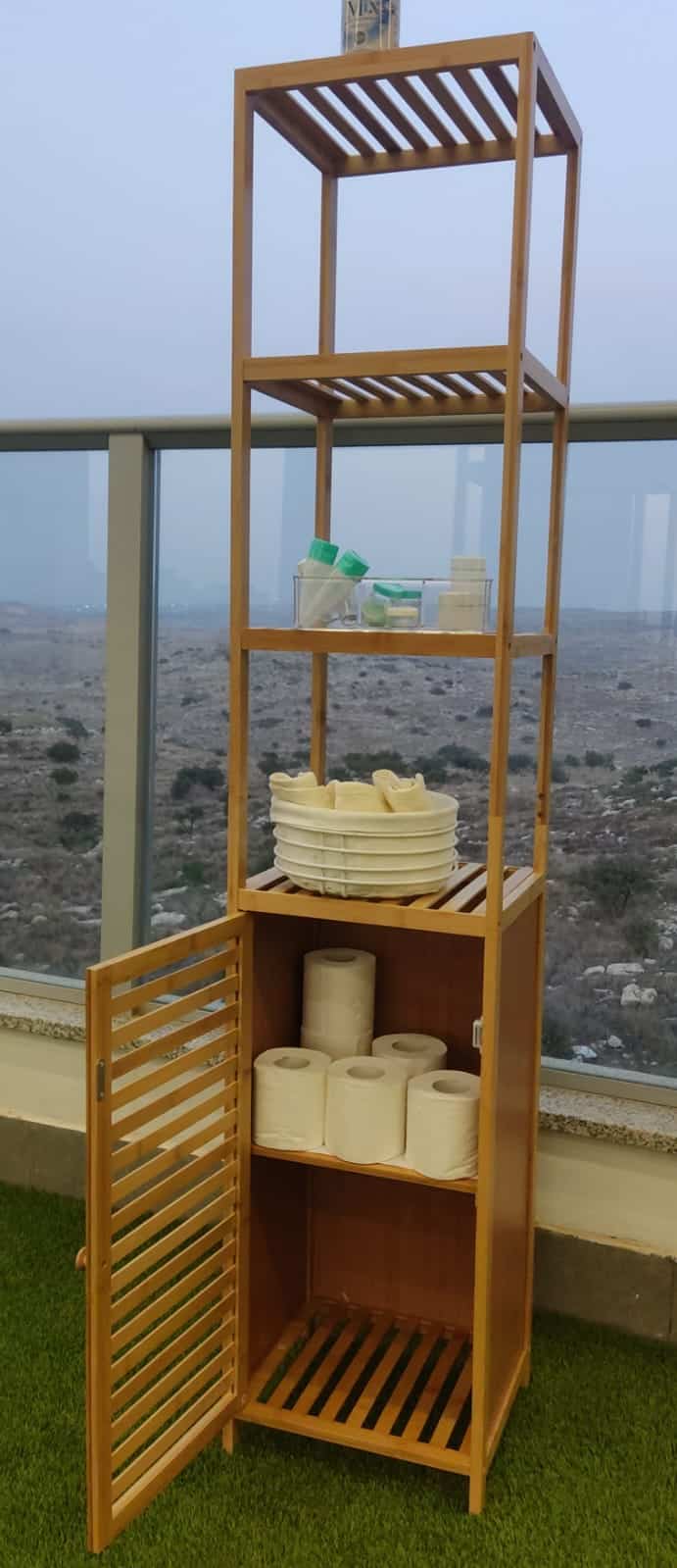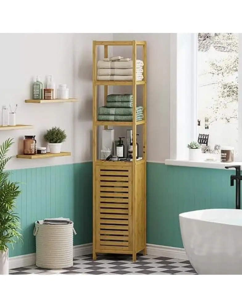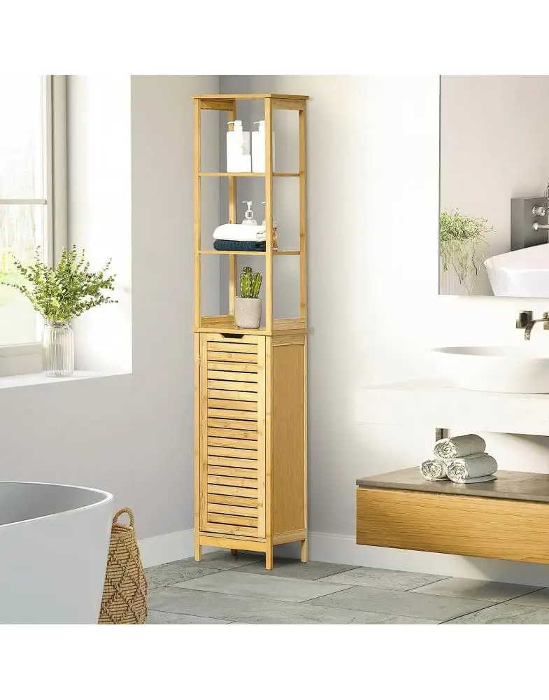 ארון במבוק גבוה מודרני לאמבטיה. אפשר גם למקם אותו בחדר השינה, בסלון, במטבח או בכל מקום אחר..