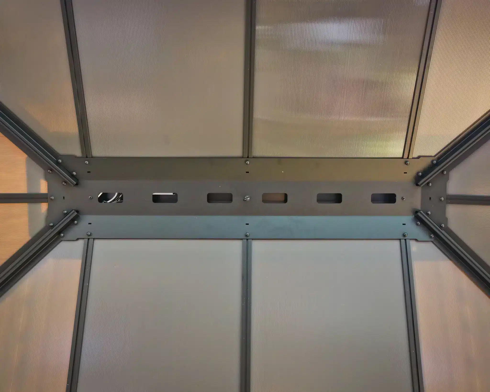 • גג עשוי פוליקרבונט בעל עמידות גבוהה בטמפרטורה ובפני שבר, בעל גוון אפור 2% עבירות אור,