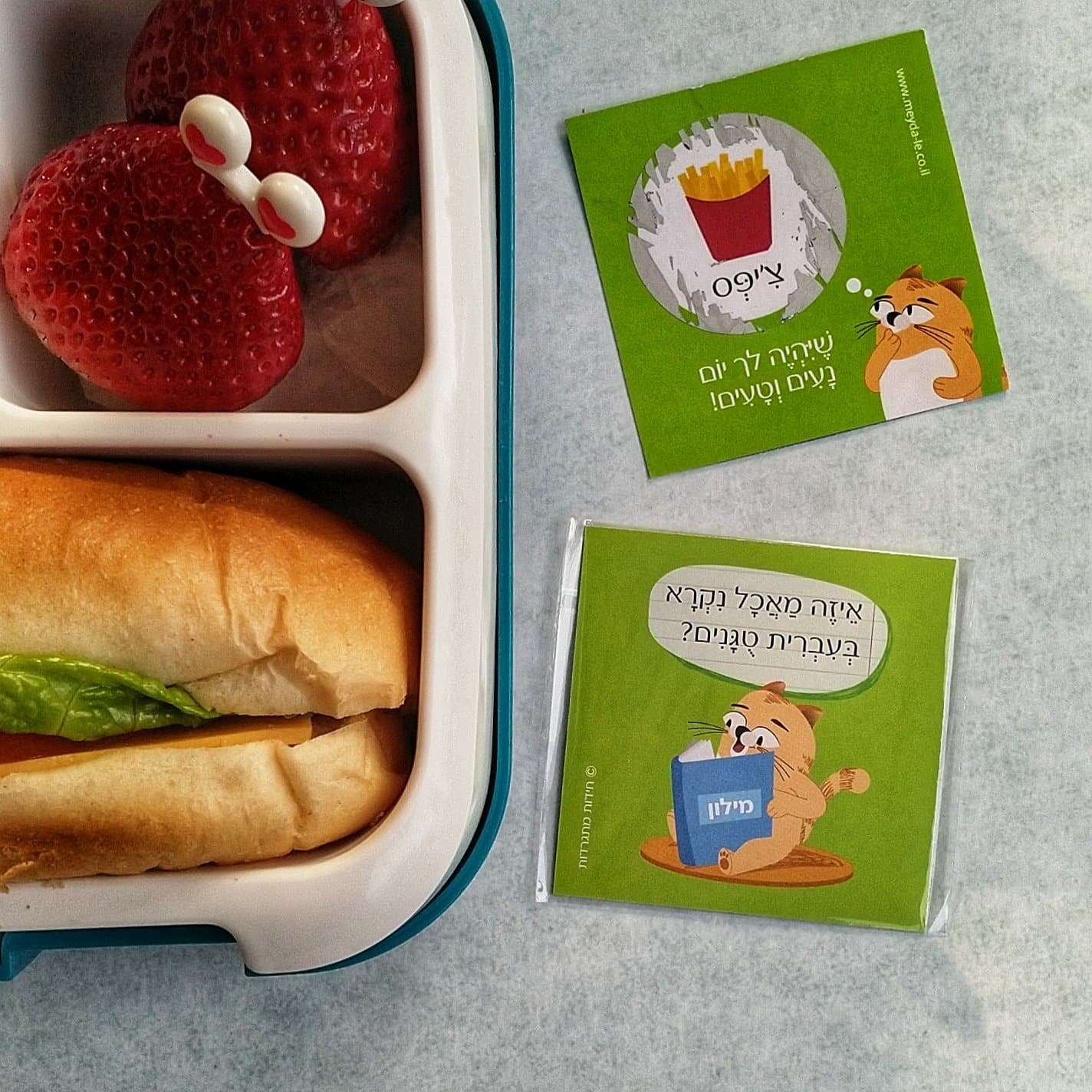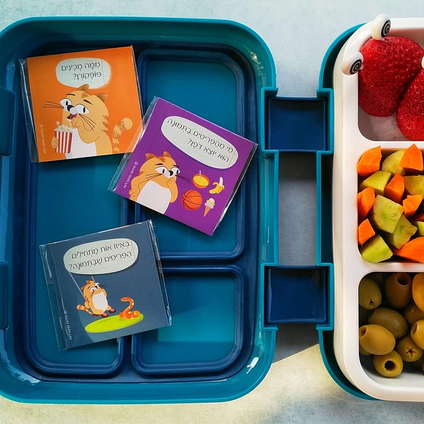 אמא, אבא, במקום להיפרד מהם בבוקר עם צביטה קטנה בלב, דמיינו שבזמן ארוחת העשר, כשכל הילדים לועסים בדממה, לילדים שלכם יש ניצוץ בעיניים כי שמת להם כרטיס של "חידות מתגרדות" בקופסה.