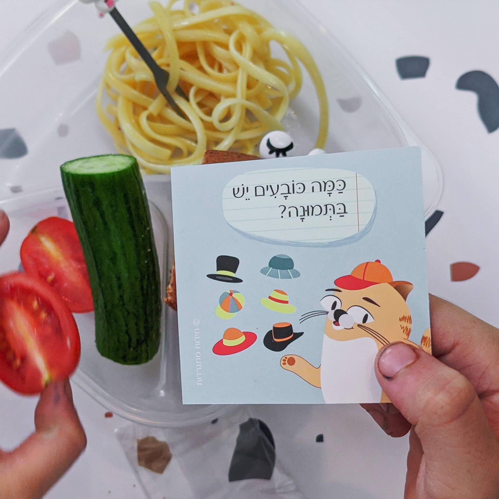 כל קופסה מכילה 50 כרטיסים באריזה צבעונית ומהודרת שכיף לקבל. כל כרטיס מגיע כיחידה עטוף בניילון ששומר עליו ממגע עם האוכל. בכל קופסה חידות במגוון נושאים: חיות, צבעים, מספרים ואותיות ועוד. המארז תומך בתכנים של הכנה לכיתה א'. הנושאים ורמת השאלות מותאמת לילדים בגילאי גן טרום-חובה וחובה. נדרש סיוע של מבוגר לקריאת השאלה: ניתן להקריא לילד בבוקר או לבקש את שיתוף הפעולה של הגננת או הסייעת בגן.