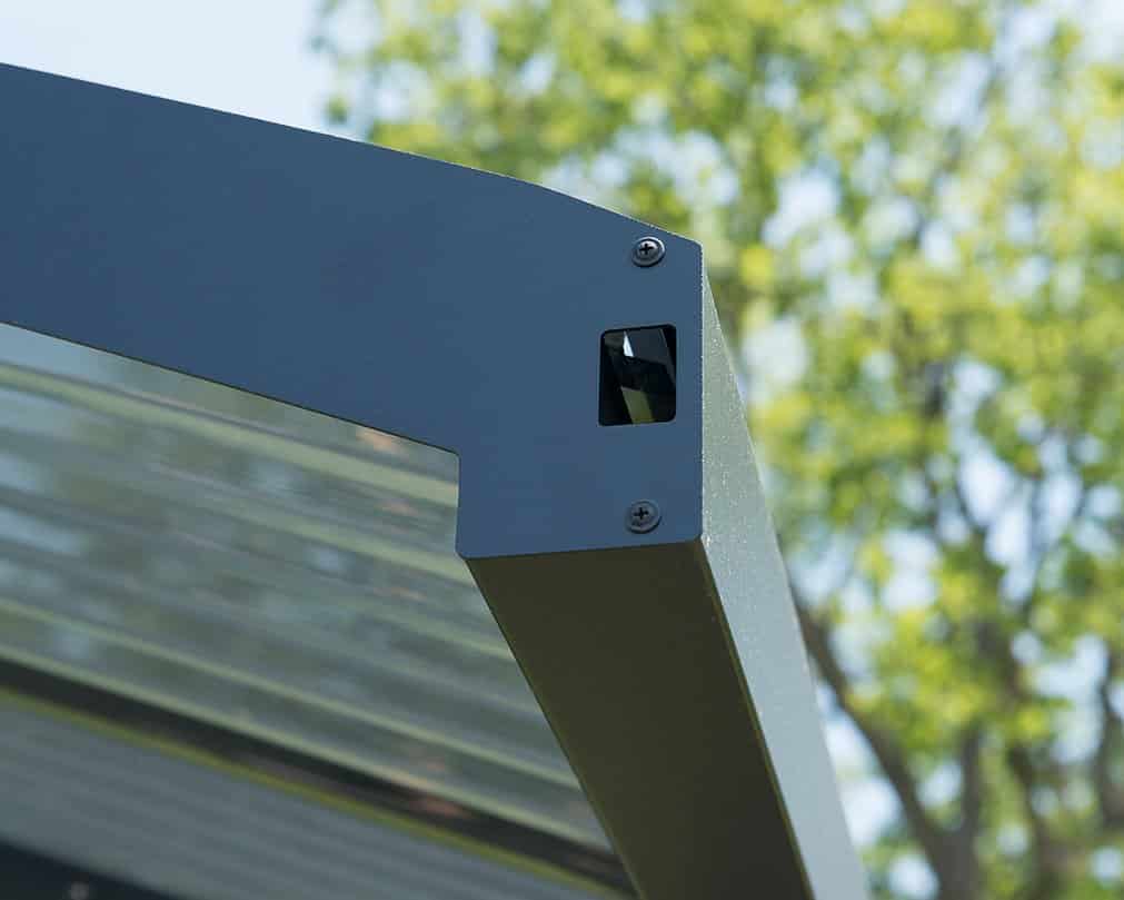 • גג פוליקרבונט עמיד בגוון אפור-סולרי בעל 10% העברת אור, מאפשר תאורה טבעית רכה בשעות היום תוך חסימת 99% מקרינה אולטרה סגולה מזיקה ומניעת נזקי דהייה.