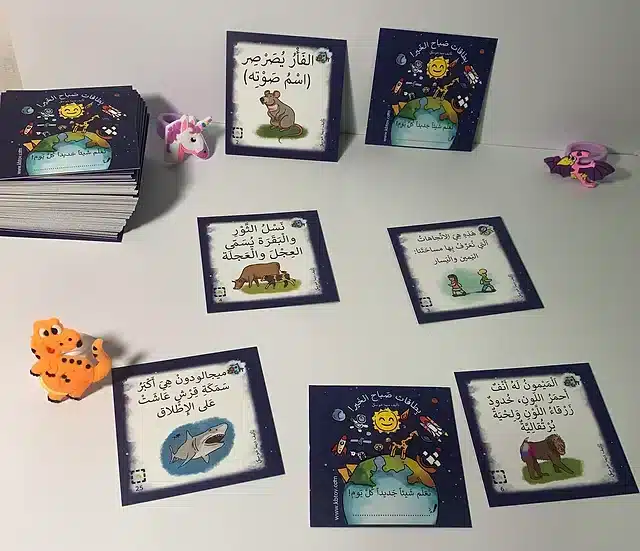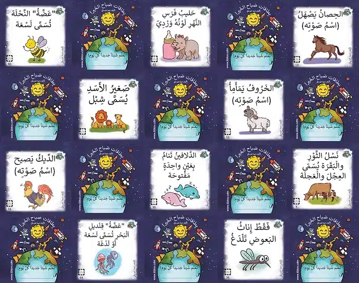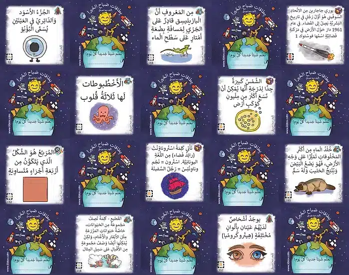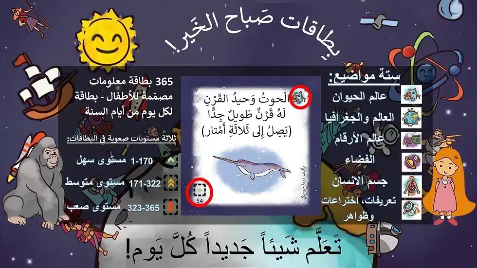 365 بطاقة معلومات مصمّمة للأطفال – بطاقة لكل يوم من أيام السنة, ثلاثة مستويات صعوبة في البطاقات, ستة مواضيع: عالم الحيوان, العالم والجغرافيا, عالم الأرقام, الفضاء, جسم الانسان, تعريفات، اختراعات وظواهر.