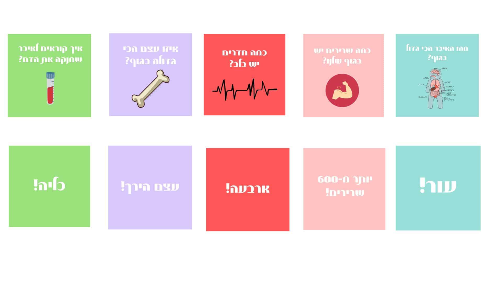 אידיאלי כמשחק חינוכי או כרטיסיות ללמידה חווייתית על הגוף האדם, ויכול לשמש בבית, בכיתה או כחלק מפעילות קבוצתית.