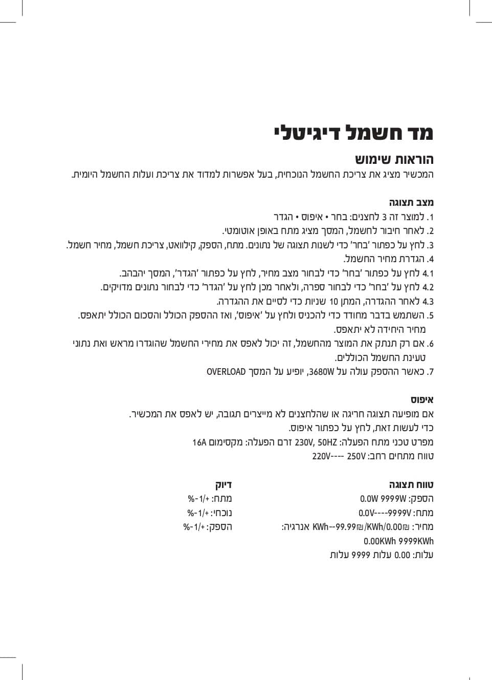 המכשיר מציג את צריכת החשמל הנוכחית, בעל אפשרות למדוד את צריכת ועלות החשמל היומית.
