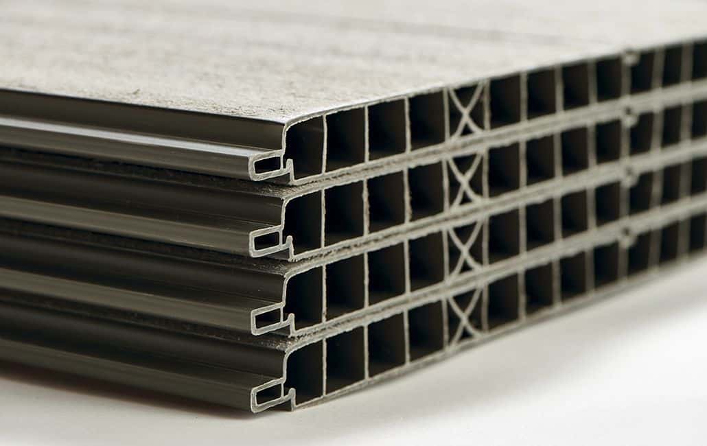 עשוי מלוחות ™DUOTECH – לוחות כפולים בעלי גימור מוברש, דמוי עץ.