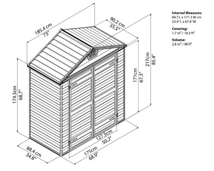חוץ: אורך – 90.2 ס"מ, רוחב – 185.4 ס"מ, גובה – 217 ס"מ