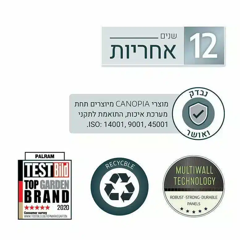 * אחריות המוצר מותנת בעיגון המוצר למשטח מפולס העשוי בטון / מרצפות / דק במעמד ההתקנה, בהתאם למפורט בהוראות ההרכבה.