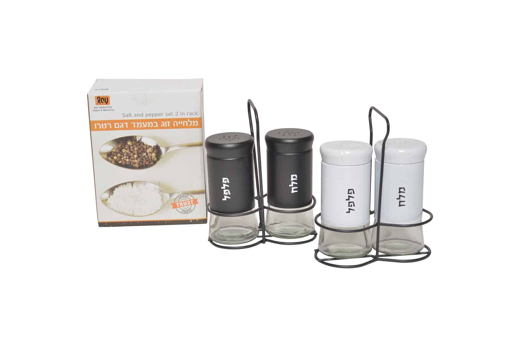 מעמד מתכת מיוחד הכולל שתי יחידות (מלחיה ופלפליה) מתכת עם תחתית מזכוכית מרהיבה.