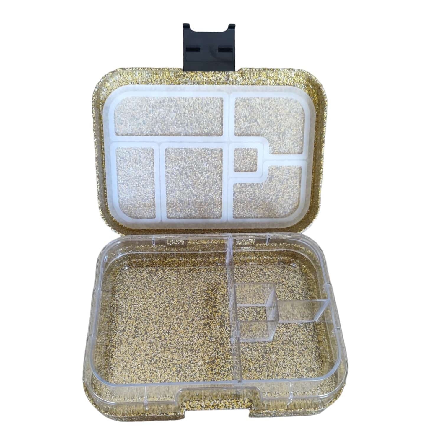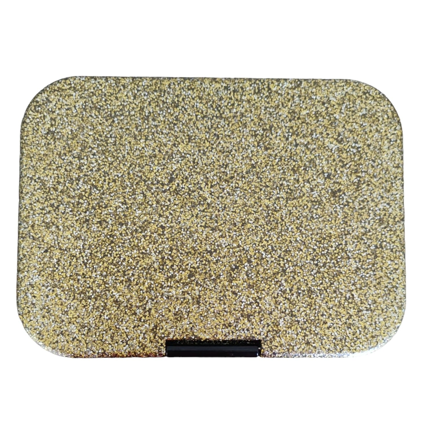 ה Munchbox Mini4 GOLD SPARKLE מורכב מקופסה חיצונית עשירה ונוצצת מזהב וכסף עם תפס שחור מדהים!